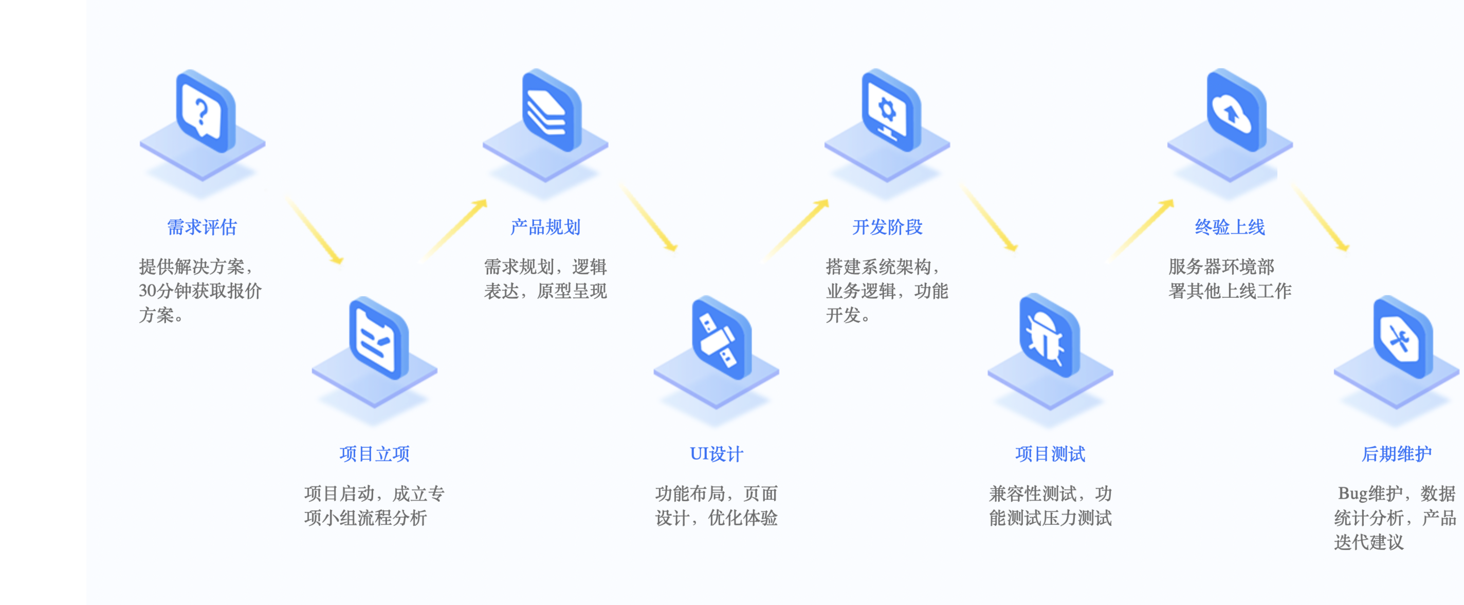 根據確定的需求和方案,進行PEST分 析模型、SWOT分析模式的市場分析, 和用戶體驗要素的精品分析,策劃出產 品原型,而UI設計經理將提供結合流行 元素、功能以及用戶感受的視覺和交互 設計。